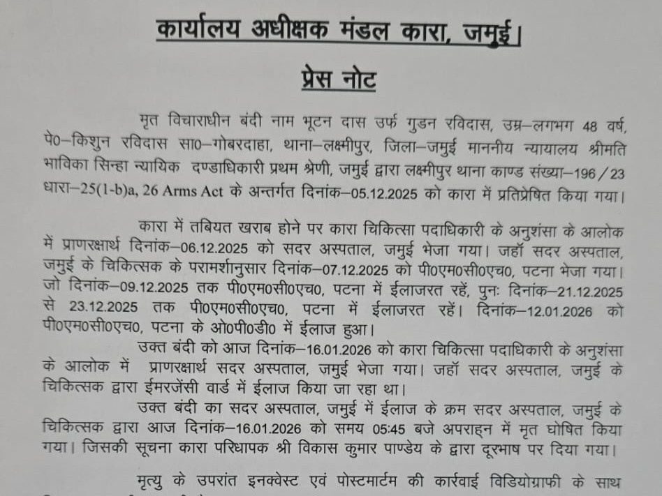 जमुई जेल में आर्म्स एक्ट के विचाराधीन कैदी की मौत:सदर अस्पताल में इलाज के दौरान हुई, परिजनों को सूचना दी गई