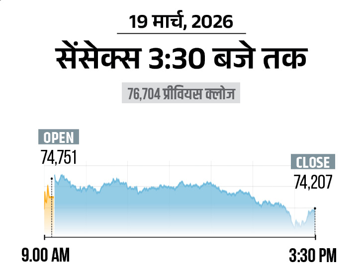 शेयर बाजार में 22 महीने की सबसे बड़ी गिरावट:सेंसेक्स 2497 अंक गिरकर 74,207 पर आया, निफ्टी 776 अंक टूटा; अमेरिका-इजराइल और ईरान युद्ध वजह